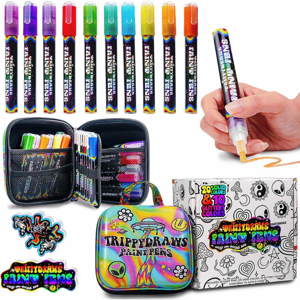 - Trippydraws 30 Premium Acrylic Paint Markers: Packaged in a unique “Trippy Carry Case,” which is not only visually appealing but also portable, making it great for travel and journaling projects.