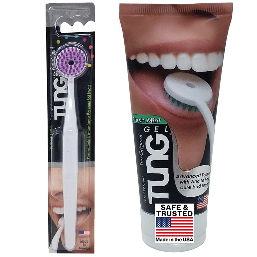 Say goodbye to bad breath and clean your whole mouth with one revolutionary brush: the Peak Essentials Tung Brush. It's designed to get deep into all the crevices of your tongue where bad breath originates and breakthrough that sticky tongue plaque so you can enjoy fresher breath.