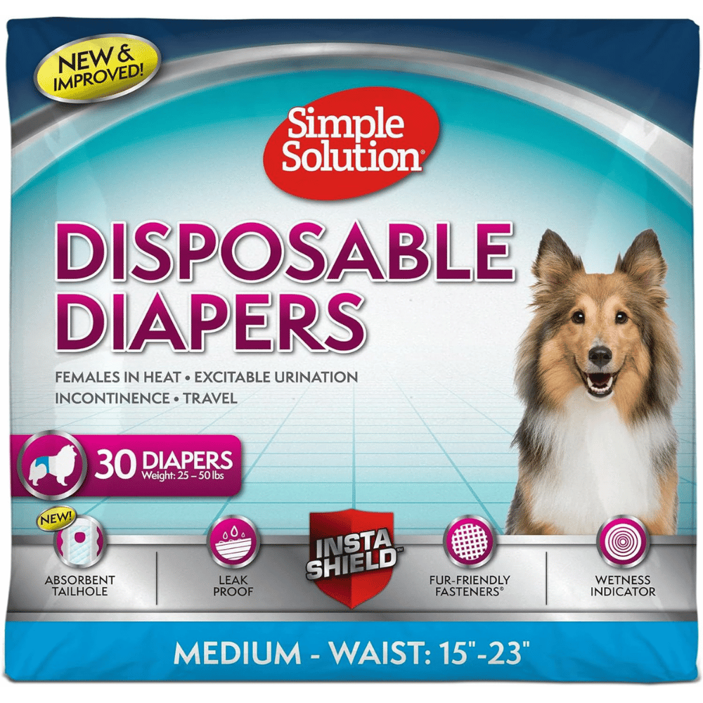 Simple Solution Disposable Female Dog Diapers: Known for their intuitive design, Simple Solution diapers feature adjustable fasteners and a tail hole for an optimal fit. The materials are incredibly soft and breathable, which prevents irritation and ensures maximum comfort for your dog, even during prolonged use.