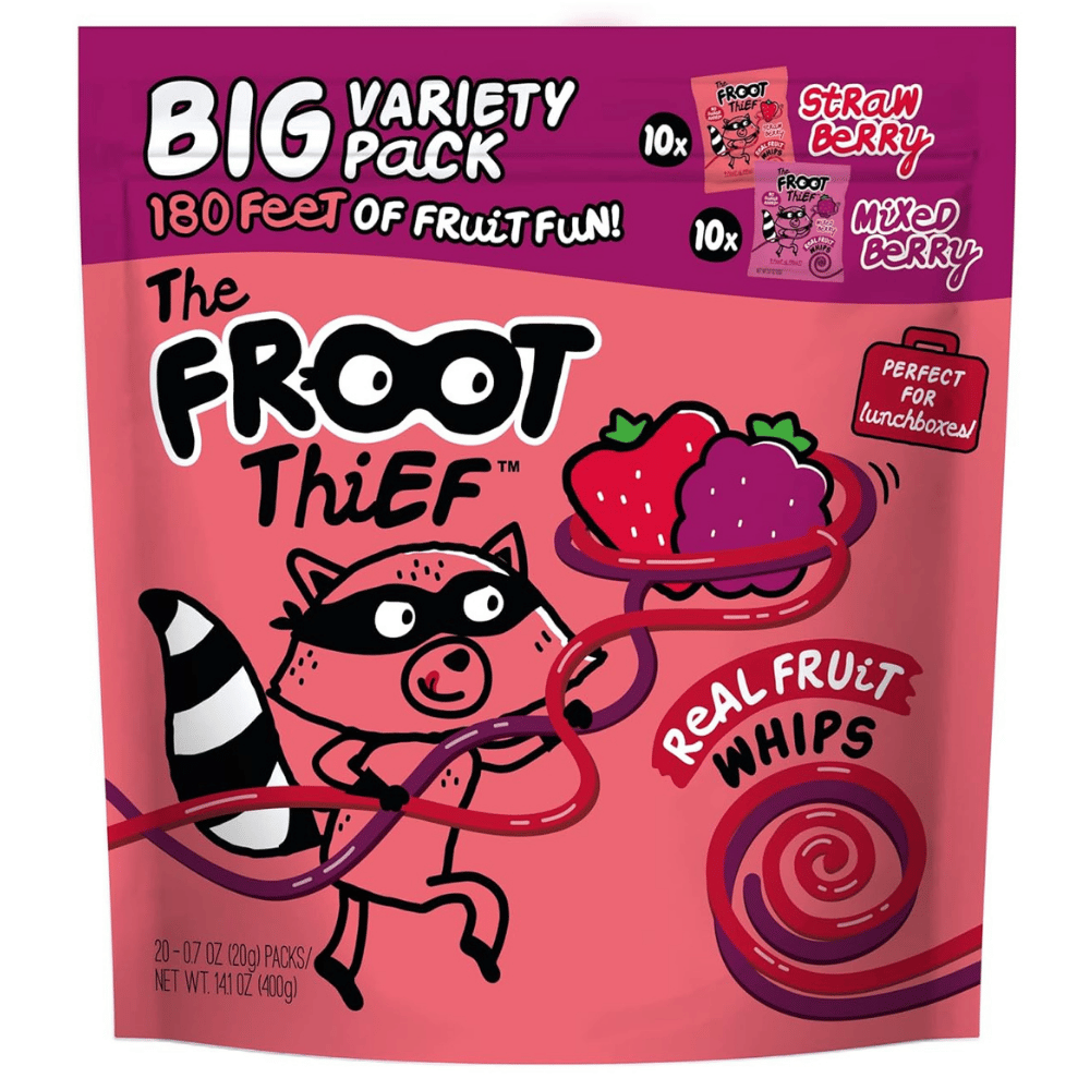 - The FROOT Thief Real Fruit Whips: With 20 individually wrapped whips, this product is perfect for grab-and-go snacking in a resealable package.