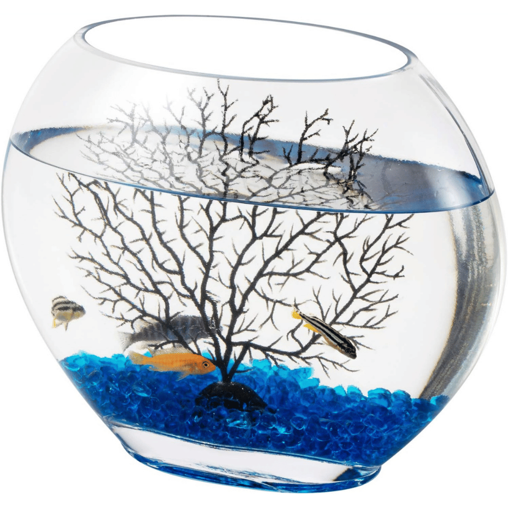 - Hygger Mini Glass Fish Bowl: The oblate, minimalistic design is modern and sleek, blending well into any home or office decor. The included decor stones and plastic fan branch tree ornament add a touch of elegance for a complete look straight out of the box.