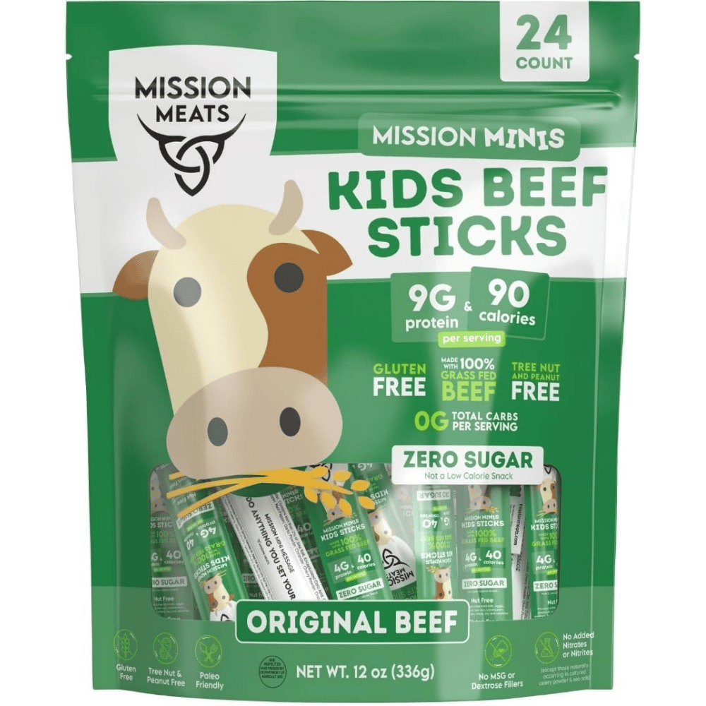- Mission Meats Kids Beef Sticks: High in protein, with 9g per mini stick, these snacks provide a quick, satiating option for active kids. Made from 100% grass-fed beef, they are zero sugar, gluten-free, and nut-free, making them suitable for those with allergies and low-carb diets.