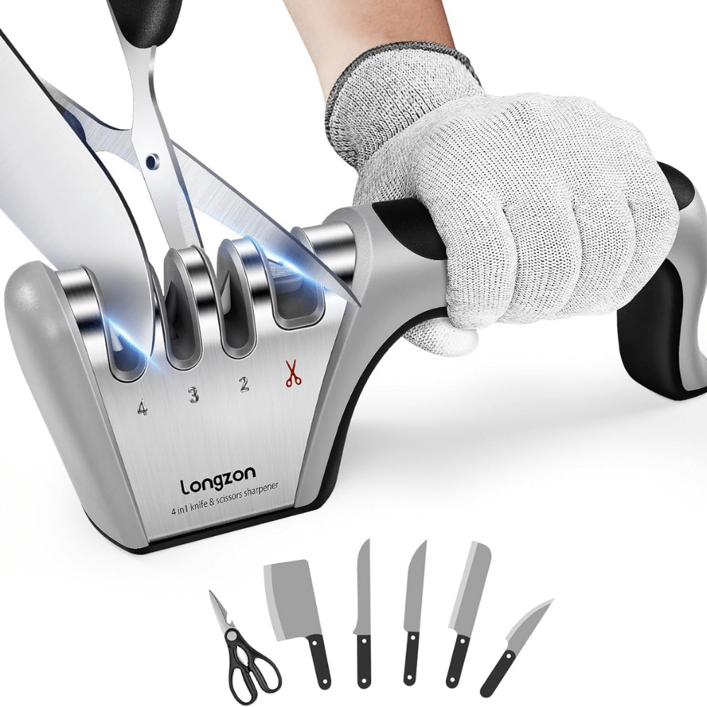- Longzon 4-in-1 Knife Sharpener: Offers great value for those looking for a versatile, durable, and easy-to-use option for all types of knives.