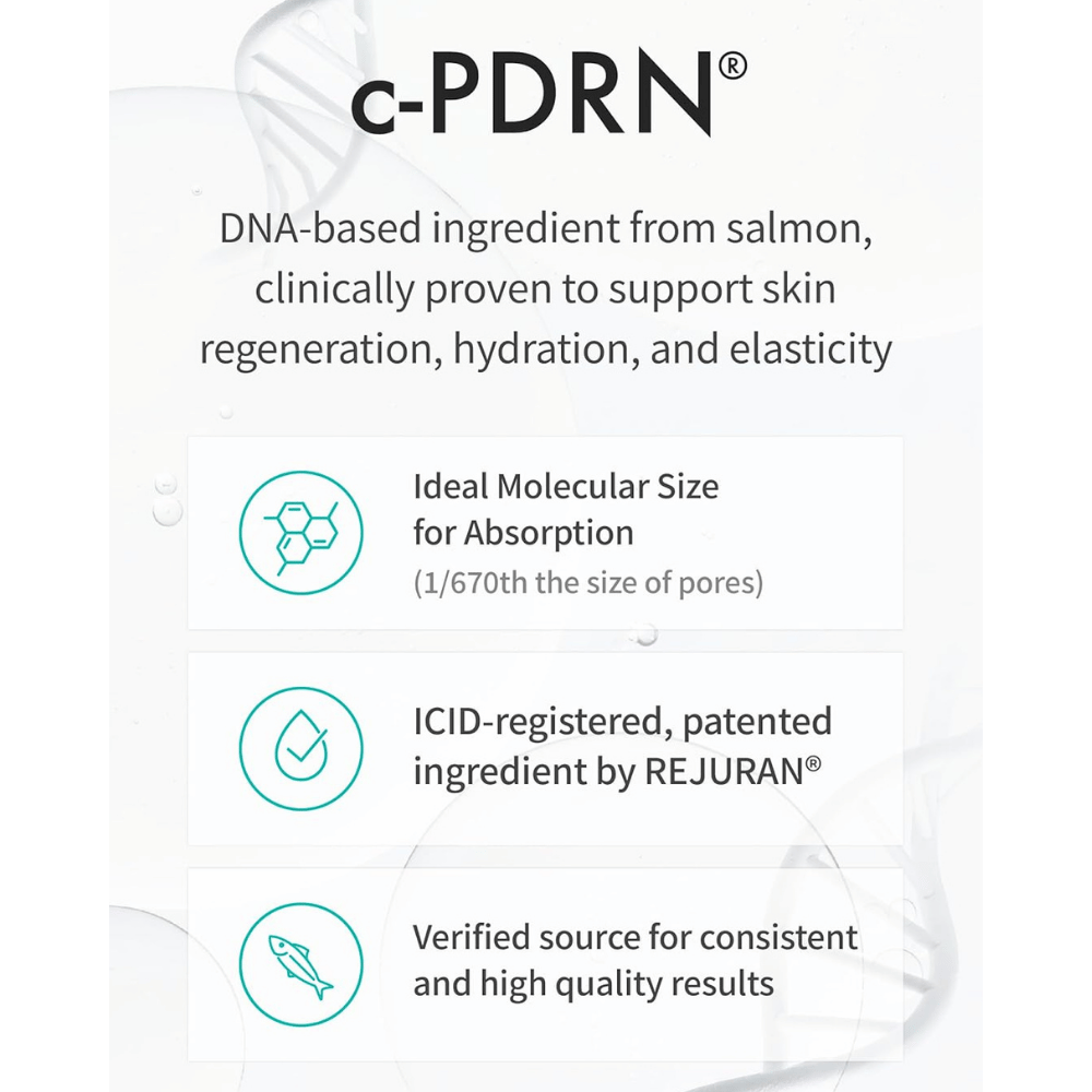 - Original Salmon DNA Technology: High-concentration c-PDRN derived from salmon DNA penetrates deep to boost collagen production and enhance skin elasticity.