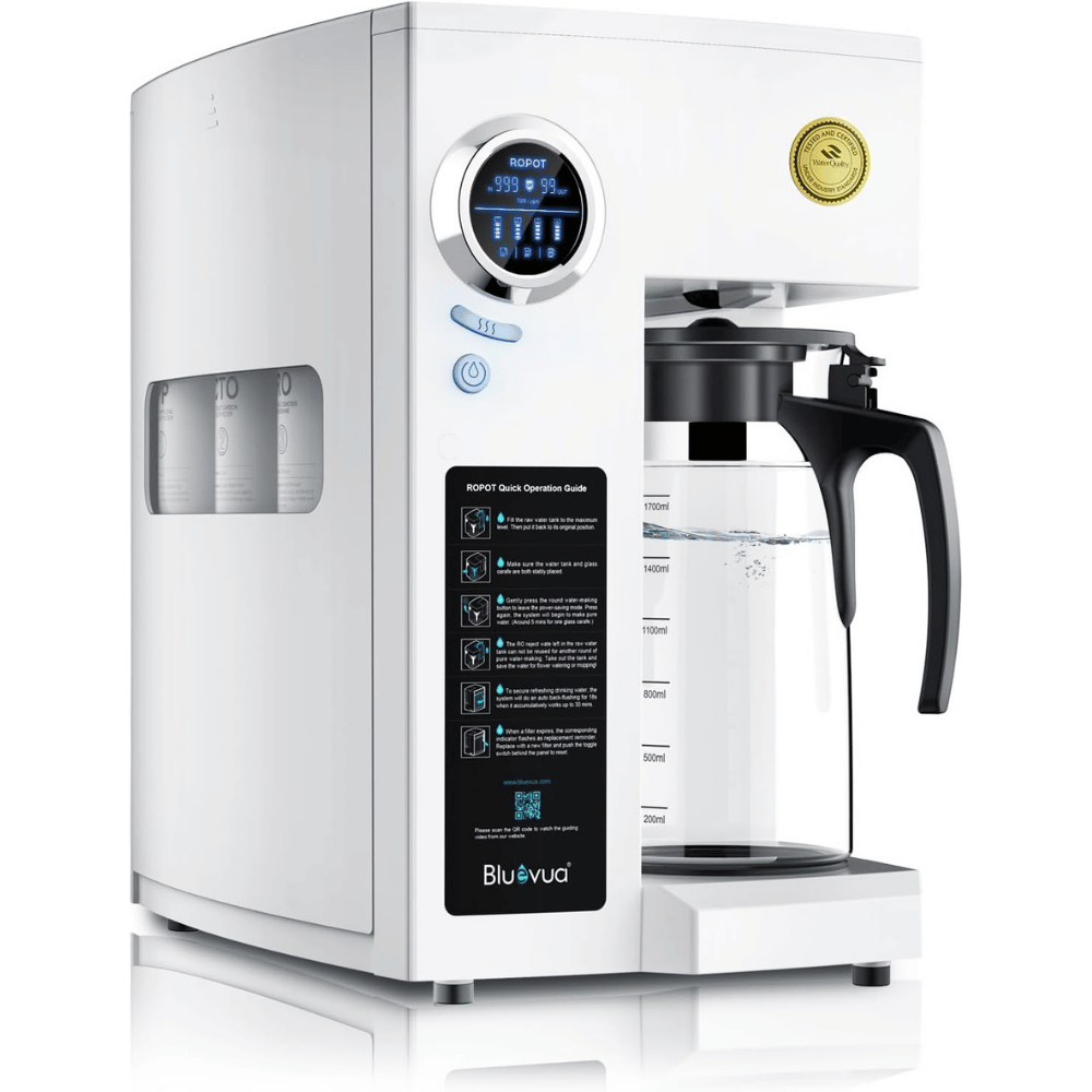 - Premium Glass Carafe: Unlike systems with plastic pitchers, the Bluevua comes with a high-borosilicate glass carafe. This ensures your purified water stays pure, without the risk of secondary pollution from plastics.