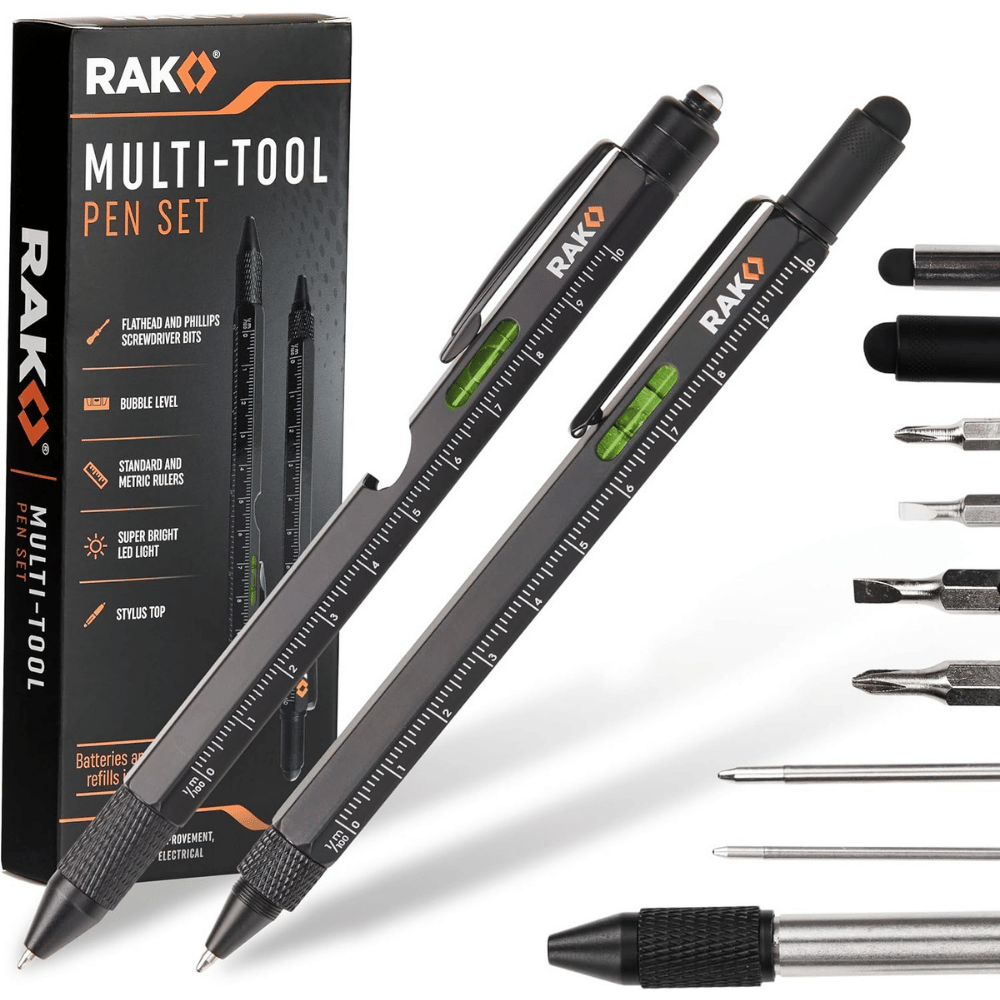 - All-in-One Convenience: The RAK Multitool Pen is a compact powerhouse with 8 practical functions, including a built-in LED light, flathead and Phillips screwdrivers, stylus, level, and bottle opener. Whether you're working in the office or tackling DIY fixes at home, it’s a tool you’ll always have on hand when inspiration or a quick repair strikes.