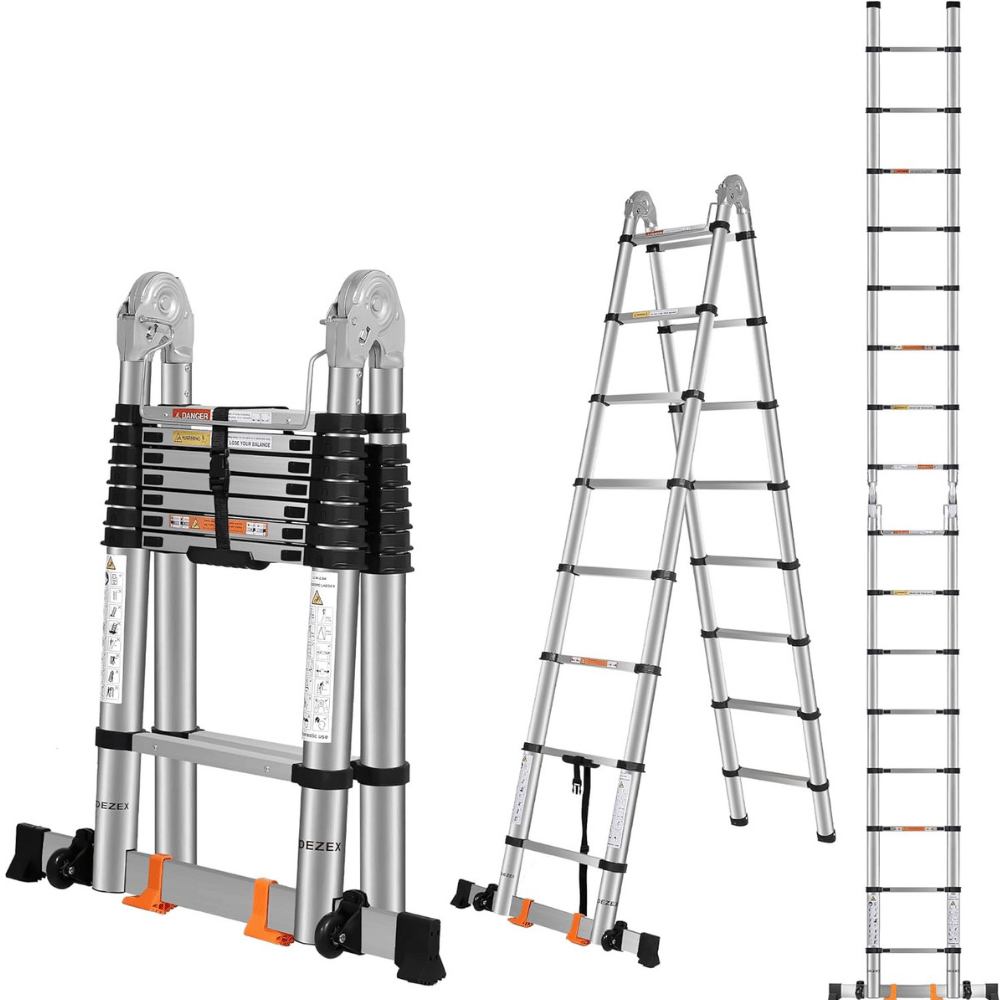 - Dezex Telescoping Ladder: Equipped with a balance bar and anti-slip feet, the Dezex ladder prioritizes safety for heavy-duty tasks. The hinge lock mechanism ensures a secure setup in A-frame mode.