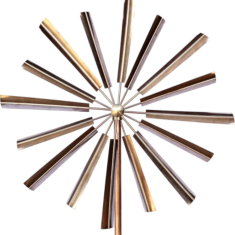 A striking, modern double-sided design with 84-inch height provides a towering focal point. The spinner's sleek, minimalist aesthetic complements a wide range of outdoor styles. - Stanwood Wind Sculpture Kinetic Copper Dual Spinner