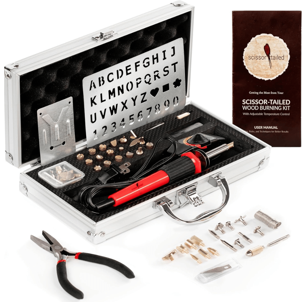 - Scissor-Tailed Premium Wood Burning Kit: This 43-piece set includes 36 tips and accessories, an adjustable temperature pen, and a deluxe storage case. It provides beginners and intermediate users with all the essentials to get started in pyrography.
